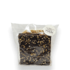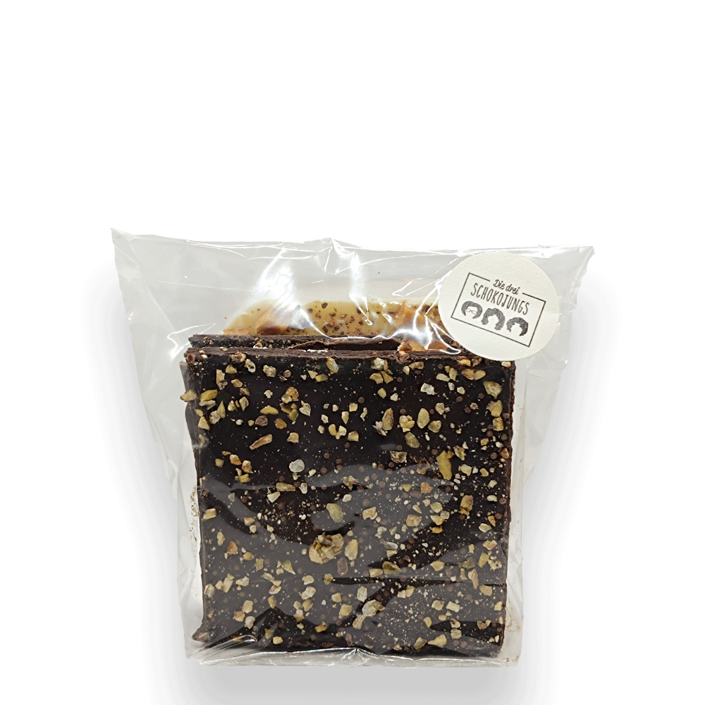 In der Schokoladenküche ist immer was los. Hier werden Kakaobohnen stundenlang conchiert oder Schokolade passend temperiert. Mal werden filigrane Pralinen gegossen und befüllt. Oder Früchte werden mit Schokolade dragiert. Und manchmal ist Zeit für Bruchschokolade. Dann werden die großen Bleche herausgeholt, um sie großzügig mit flüssiger Kakaomasse zu bestreichen. Natürlich mit allen drei Sorten. Weiße Schokolade, Vollmilchschokolade und Zartbitterschokolade landen jeweils auf den Blechen. Im Anschluss wird nach Lust und Laune per Hand dekoriert. Wenn die Toppings auf die Schokoladenmasse treffen, entstehen einzigartige Nasch-Kunstwerke. Dann braucht es mindestens eine Nacht Geduld, bis die Schokolade fest ist. Erst danach kommt das Beste – das Brechen in Stücke. Könnt Ihr Euch vorstellen, wie laut das knackt und wie schokoladig das duftet? Schnell in die Beutel gepackt, damit Ihr sie genießen könnt.