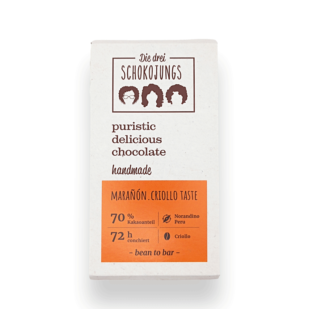 Edel-Bitterschokolade (mit mindestens 70 % Kakao) aus der Criollo-Kakaobohne – angebaut in Peru, im Delta des Marañón-Flusses.
