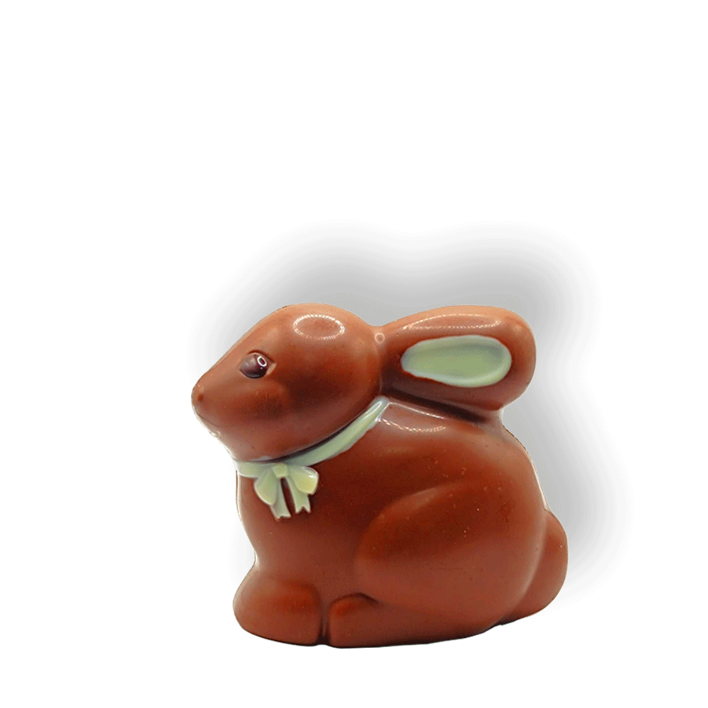 Mit seiner runden Form, den aufgestellten Ohren und der kleinen Schleife wirkt dieser Hase, als hätte er es sich gerade im Ostergras gemütlich gemacht. Genau richtig für einen süßen Moment zwischendurch. Die cremige Vollmilchschokolade schmilzt angenehm auf der Zunge und macht jeden Bissen zu einem kleinen Genussmoment.