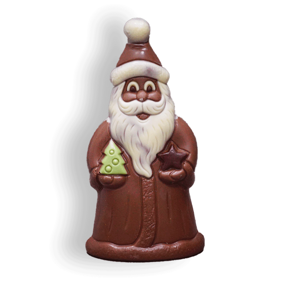 Nikolaus aus Vollmilchschokolade (mindestens 38 % Kakao) mit zahlreichen von Hand bemalten Details wie dem Bart, dem Mützenbund und Bommel (in weißer Schokolade), dem Stern und den Augen (in Zartbitterschokolade) und dem Tannenbäumchen.