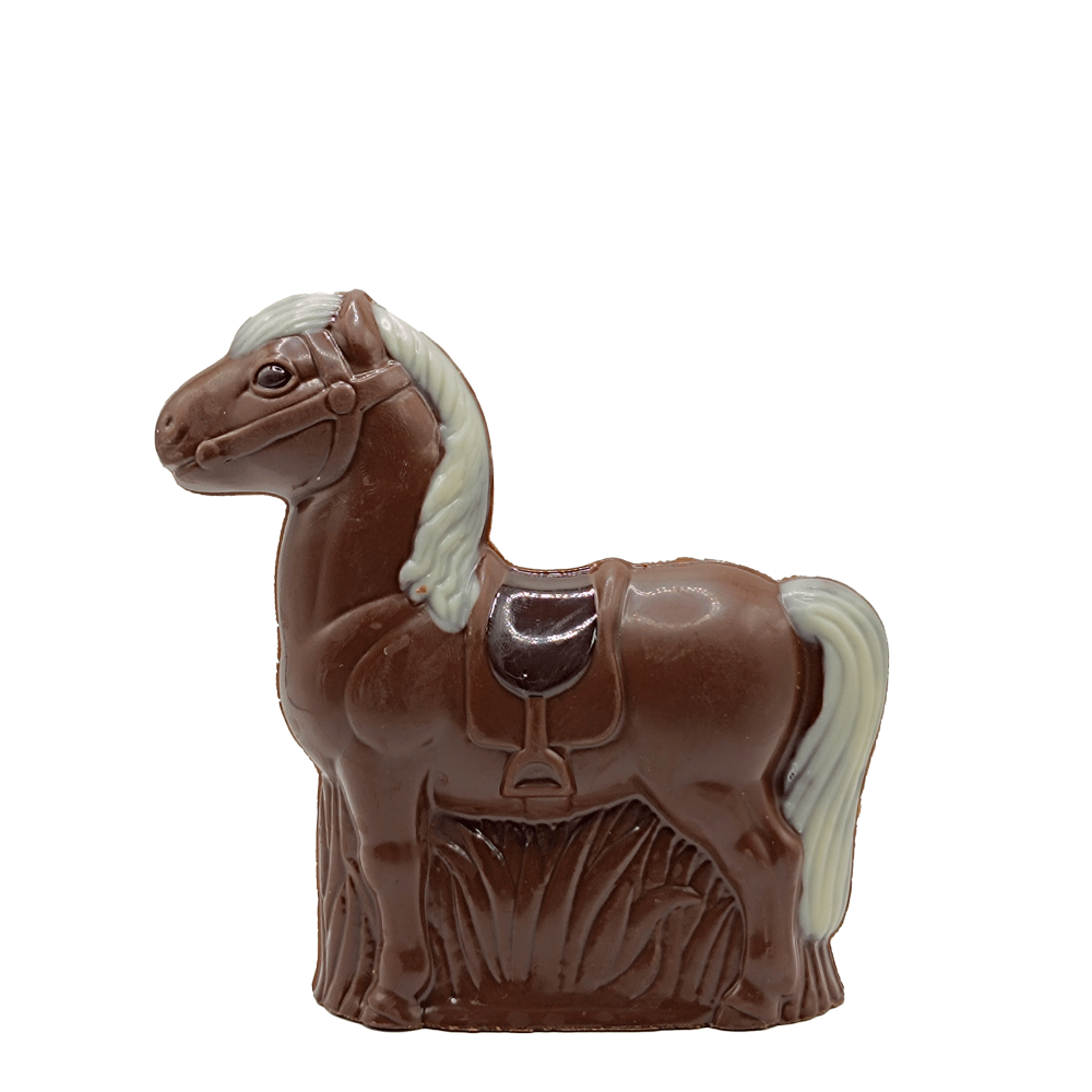 …aber bei der Herstellung unserer Schokoladenfiguren stehen Gestalt und Geschmack an oberster Stelle. Bei diesem Pferd sind viele Feinheiten in die Form geprägt wie Zaumzeug, Nüstern, Satteldecke, Steigbügel sowie die Struktur von Mähne, Schweif und Beinen. Habt Ihr den Hintergrund schon entdeckt? Ebenfalls in die Form eingelassen ist die Wiese, auf der das Pferd steht. Klar, dass wir auch bei unseren Zutaten großen Wert auf die Qualität der einzelnen Bestandteile legen.