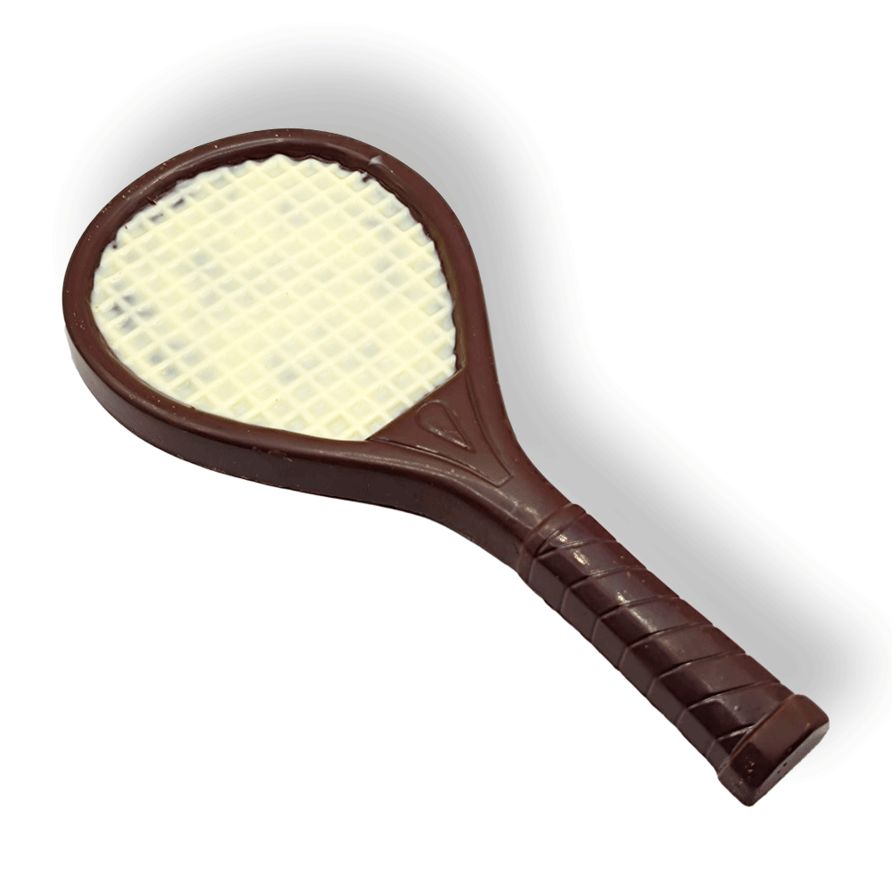 Tennisschläger (mindestens 40% Kakao) aus Vollmilchschokolade. Die Bespannung wurde mit weißer Schokolade hervorgehoben und bildet das typische Saitenmuster des Schlägers.